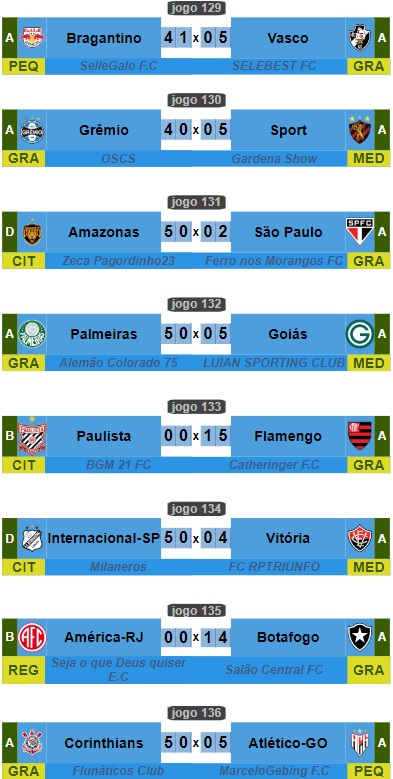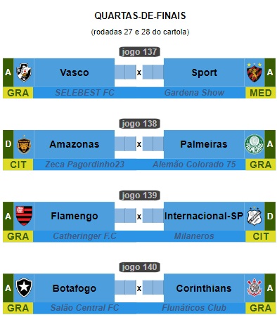 Por fim, tivemos o Corinthians, liderado pelo "Flunáticos Club", bicampeão da Copa do Brasil, carimbando participação em mais uma quartas-de-final. Valendo-se da vantagem de jogar por dois empates, o bicho papão "flunáticos" é agora o único dos oito treinadores cassificados para as quartas que está no comando do seu clubes desde a primeira fase da competição. De lá para cá, lista de clubes vitimizados pelo técnico mais vitorioso deste site chegam a seis: Tocantinópolis, Souza, Remo, Volta Redonda, Bahia e Atlético-GO. Próxima fase, cujo primeiro confronto ocorrerá somente na rodada 27, Corinthians medirá forças contra o Botafogo do "Salão Central FC", um dos piores clubes da divisão de elite, na 18ª posição, com o atual treinador não tendo vencido nenhuma partida sob o comando da equipe desde que assumiu na rodada 18, situação esta que só não gerou demissão graças a estabilidade que todo treinador disfruta enquanto "vivo" em Copa do Brasil, Sulamericana ou Liberdatores da América.