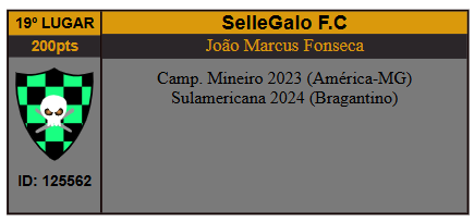Com o título, o Sellegalo F.C, do cartoleiro João Marcos Fonseca, saltou do 45º posto para a 19ª posição do ranking geral dos melhores treinadores de todos os tempos,