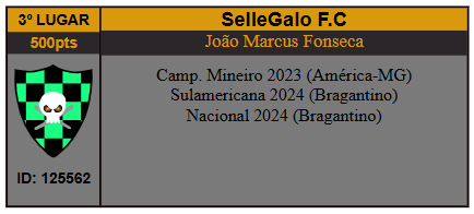Com o título, "Sellegalo F.C", do cartoleiro João Marcos da Fonseca, saltou da 17ª para 3ª colocação do ranking de treinadores,