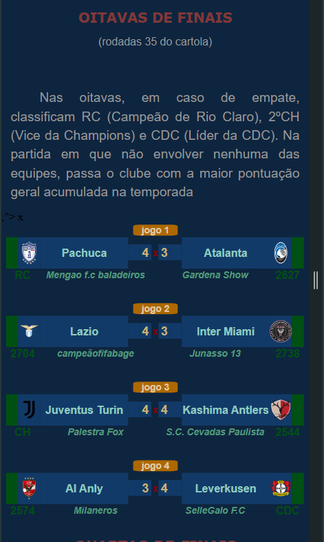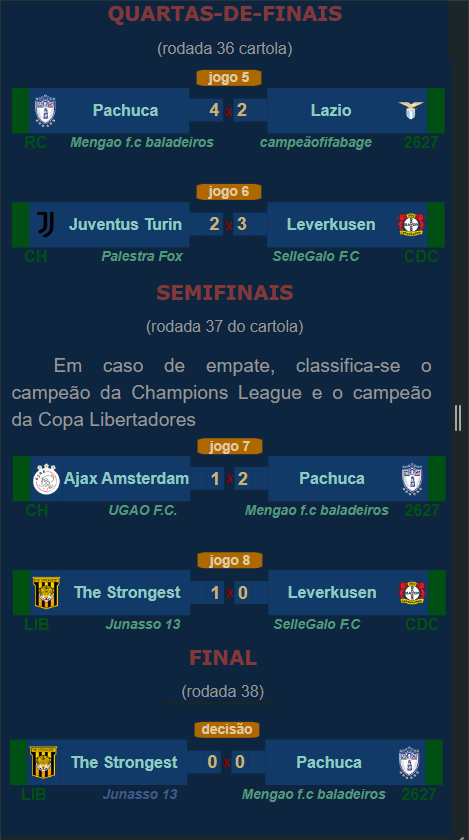 Na partida entre Ajax do "UGAO FC" contra o Leverkusen do "Sellegalo F.C", melhor para o Ajax, favorecido com o empate por 0x0 (52x55) em razão de ter chegando na condição de campeão da Champions League.